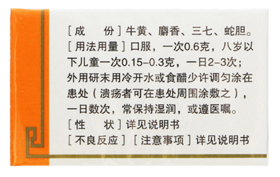 田七人参85%、蛇胆7%、牛黄5%、麝香3%。